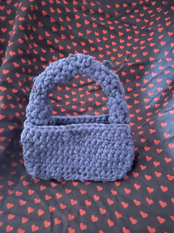 Еко-сумка з переробленої трикотажної пряжі — міцна, стильна та об’ємна. Кожна модель унікальна та неповторна завдяки використанню перероблених матеріалів. Розмір 15×9 см, дно 7 см, ручка 31 см.