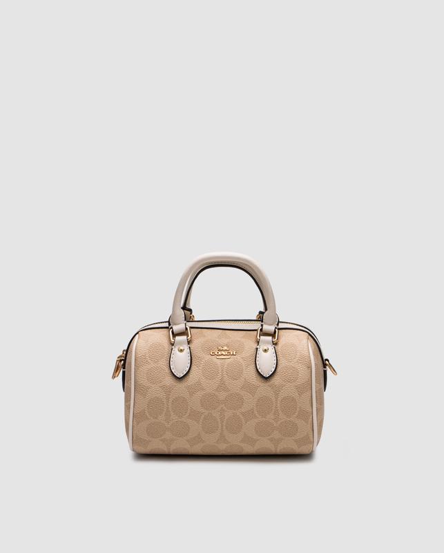 ❤️ Rowan Satchel In Signature Canvas Beige/Ginger (Арт: 99971) ⏺ Розмір: 18 х 12 х 8 см ⏺ Матеріал: Шкіра Сумка виготовлена з зернистої шкіри з фірмовою канвою. Всередині одне основне відділення. Підкладка з щільного текстилю, має шкіряну нашивку з фірмовим тисненням. Зачиняється сумка на застібці. Фурнітура металева, брендована. Має шкіряні ручки для носіння у руці, також шкіряний ремінець для носіння через плече (регулюється за довжиною та пристібається на карабінах). Комплектується у фірмовій крафтовій коробці та пильовику, є буклети.