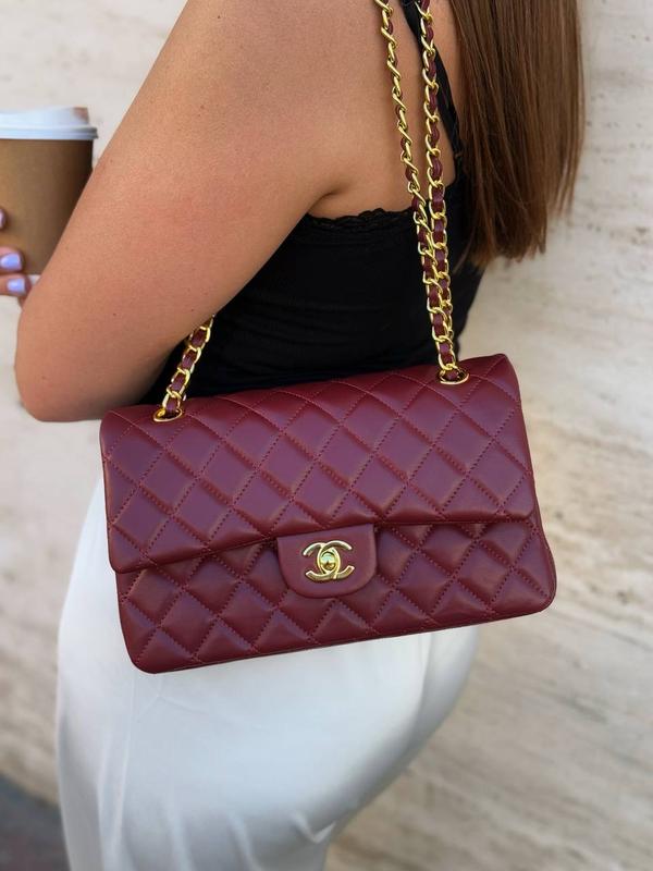 Бордовая кожаная сумка стеганая шанель 25,5 см шкіряна бордова сумка