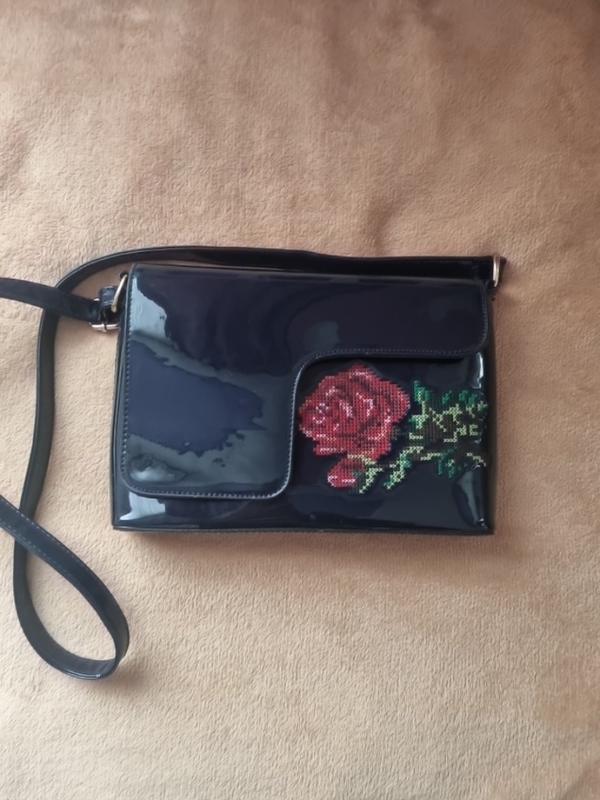 Сумка жіноча, лакована, прикрашена вишивкою. довгий ремінець