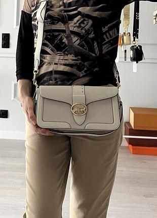 Coach Georgie Shoulder Bag Сумка через плече виготовлена з високоякісної шкіри в простому, ніжному та сучасному дизайні. Застібка прикрашена оригінальною формою у вигляді каретки. Розкішний кремовий відтінок дозволить легко поєднувати сумочку з будь яким одягом Має з‘ємну шкіряну ручку та ремінець для носіння через плече