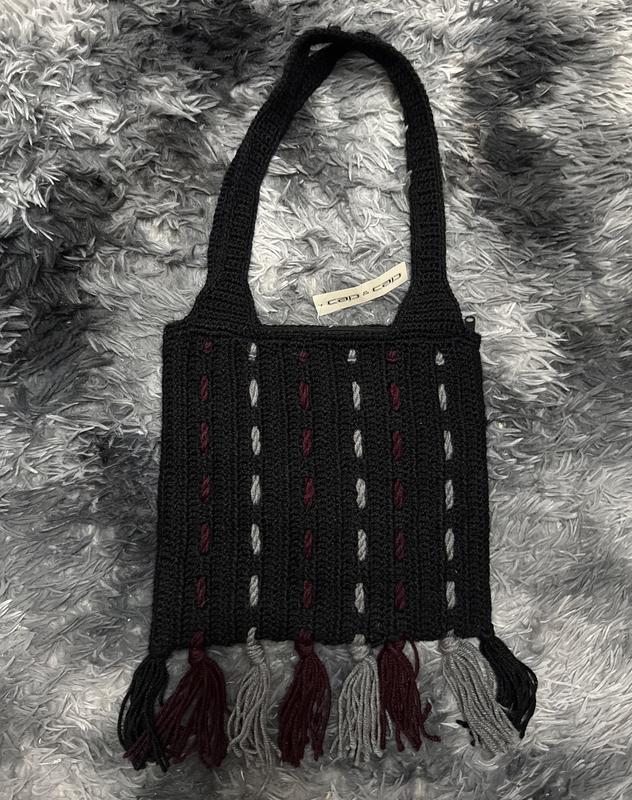 Нова чорна в'язана сумка з ручкою, прикрашена вертикальними смугами білого та бордового кольорів. Сумка має пензлики внизу, які відповідають кольорам смуг. Нова, фірмова, дуже мʼяка та приємна фірми "cap & cap". На одне відділення, застібка на змійку, не маленька, середній розмір, вмістка Всі бірки на фото, фото на собі не роблю