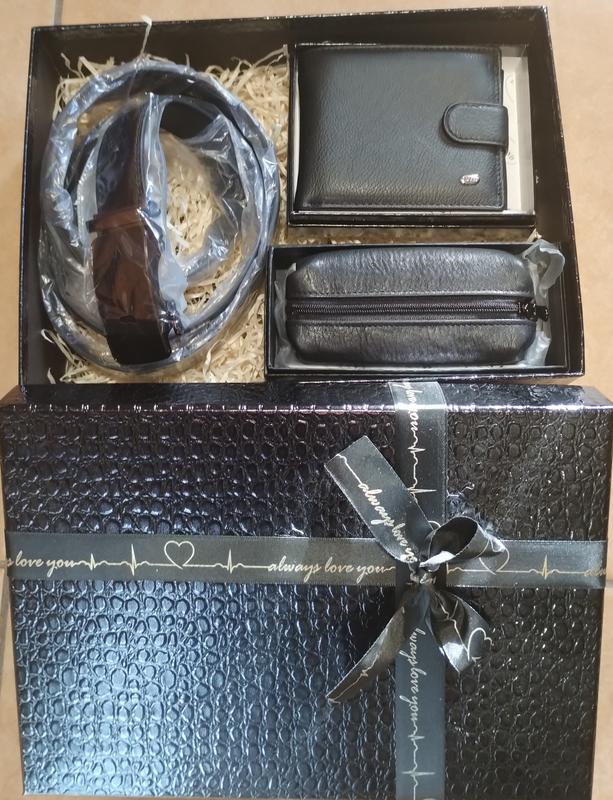 Чоловічий набір з натуральної шкіри В комплекті гаманець, ключниця ремінь і подарункова коробка.
