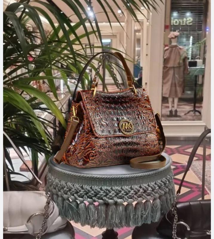 коричнева сумка-сатчел із тисненим візерунком під крокодилячу шкіру та логотипом FIMKA. В новому ідеальному стані Розмір ширина 25 Висота 22 Збоку 10 Део 27/11 Ручка коротка Довгий ремінець не рідний, але підходить!!! Можна зняти