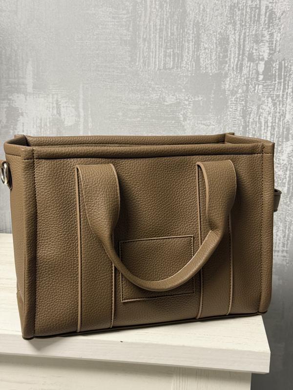 Стильна структурована сумка у форматі tote — стримана, елегантна й універсальна. Виглядає мінімалістично. Колір: теплий карамельно-коричневий (camel / mocha) Матеріал: текстурована еко-шкіра з тисненням під натуральну — щільна, матова, з грубою зернистою фактурою. Не блищить, що додає преміального вигляду. 📦 Функціональність • Формат — середній або великий (tote-bag), містка. • Підійде для документів, планшета, косметички, щоденного набору речей. • Широке дно забезпечує стійкість на поверхні та гарну організацію всередині. 👗 Стиль і використання Ця сумка — універсальний варіант на кожен день: • офіс • навчання • повсякденні виходи • класичні та casual образи • базова сумка під будь-який сезон