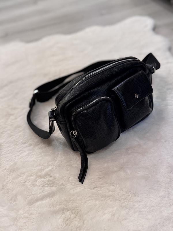 Бренд: Оригінал PULL&BEAR. Матеріал: Якісна чорна екошкіра з вираженою фактурою. Колір: Класичний чорний, що легко поєднується з будь-яким одягом. • Ремінець: Широкий, регульований, текстильний (або нейлоновий) ремінець для максимального комфорту при носінні через плече.