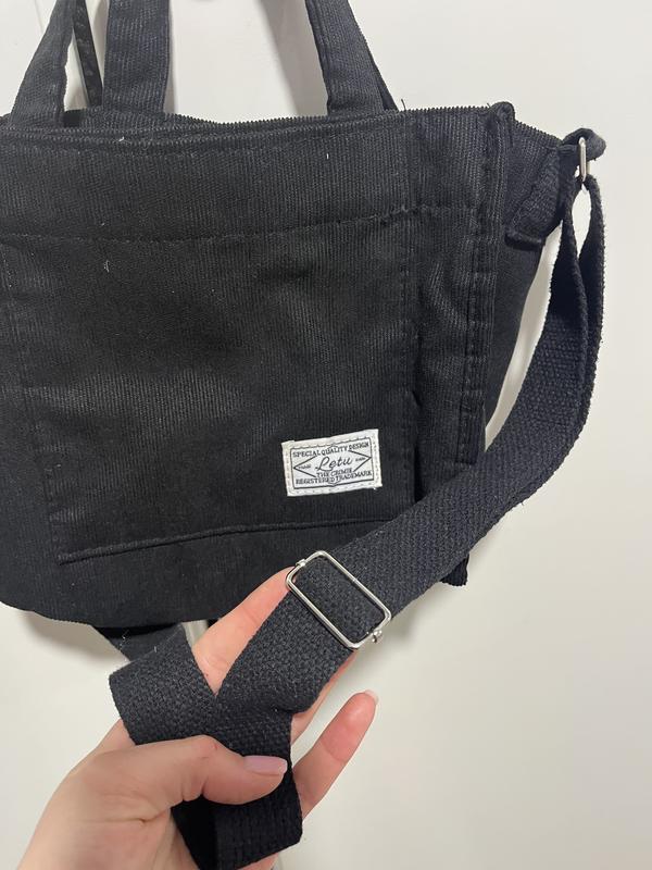 чорнрй шопер-сумка чорного кольору має білу емблему знизу і ще має дефект якого не видно має два відділення одне менше друге більше має закльопку має два види ручок одна довка інші дві короткі