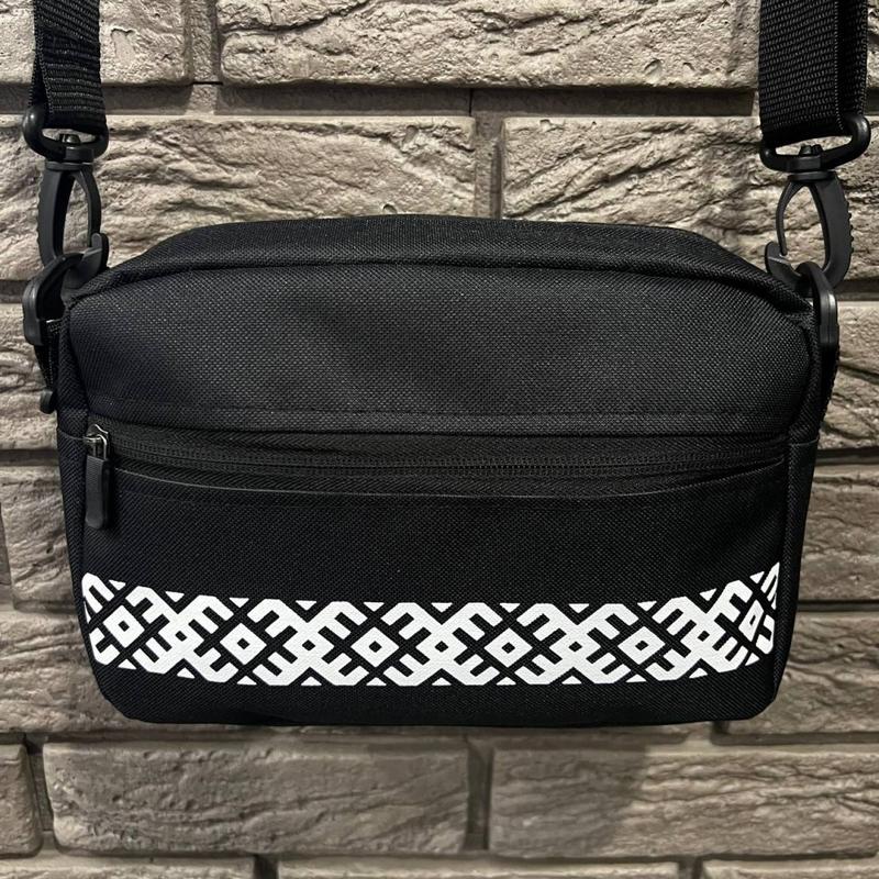 Барсетка горизонталь чорна з орнаментом (білий): - Розмір: 17 x 25 см; - Матеріал: Оксфорд 600d — синтетичний матеріал, що має водовідштовхувальне просочення; - Орнамент: накатка білого кольору; - Регульована довжина ремінця, якісна фурнітура; - Основне відділення на змійці, всередині є додаткова підкладкова кишеня (без змійки); - Караман на лицьовій стороні на змійці; - Зворотний бік барсетки має додатковий поролоновий ущільнювач, що дає виробу добре тримати форму. Барсетка підходить для повсякденного міського стилю, а також під спортивний стиль. Звільне руки та кишені, а також доповнить Ваш стильний образ.