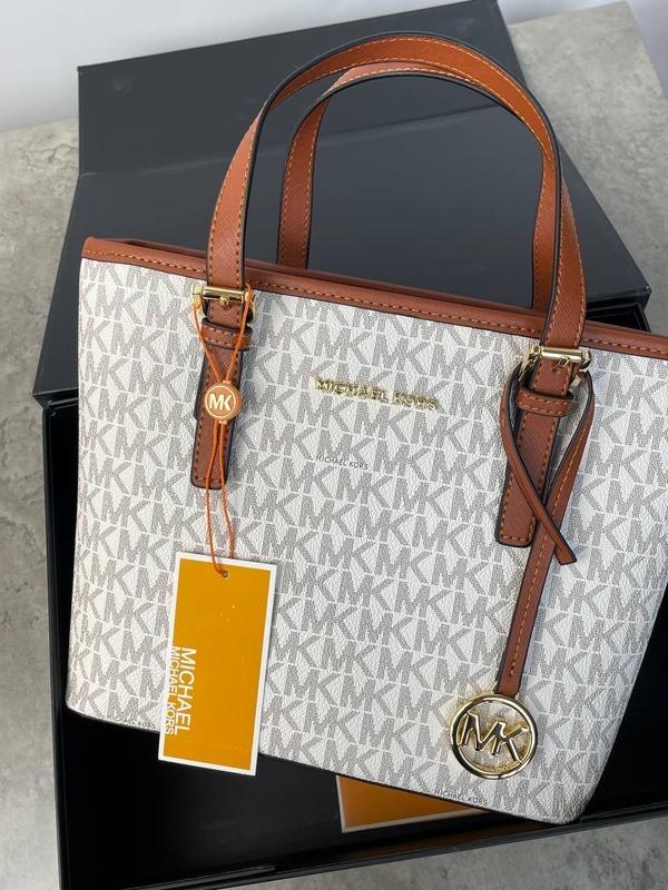 Розмір: 26 × 20 × 10 см • Матеріал: Шкіра + фірмовий текстиль MK • Колір: Бежевий з коричневими ручками • Фурнітура: Золота, підвіс-логотип MK • Ручки: Дві короткі ручки • Відділення: Основне відділення + внутрішня кишенька • Особливість: Легка та зручна модель з упізнаваним принтом MK — стильна сумка для щоденного використання, що поєднує елегантність та практичність 🤎
