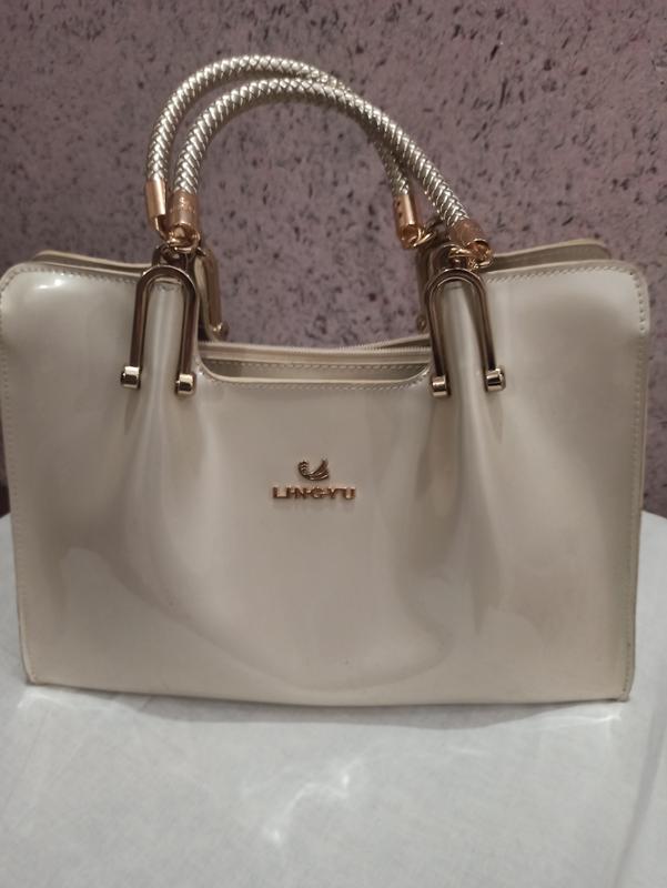 Сумка женская лакированная, молочно-бежевого цвета, имеет жесткий каркас, ширина 32х13,5, высота 22 см, хорошее состояние без дефектов