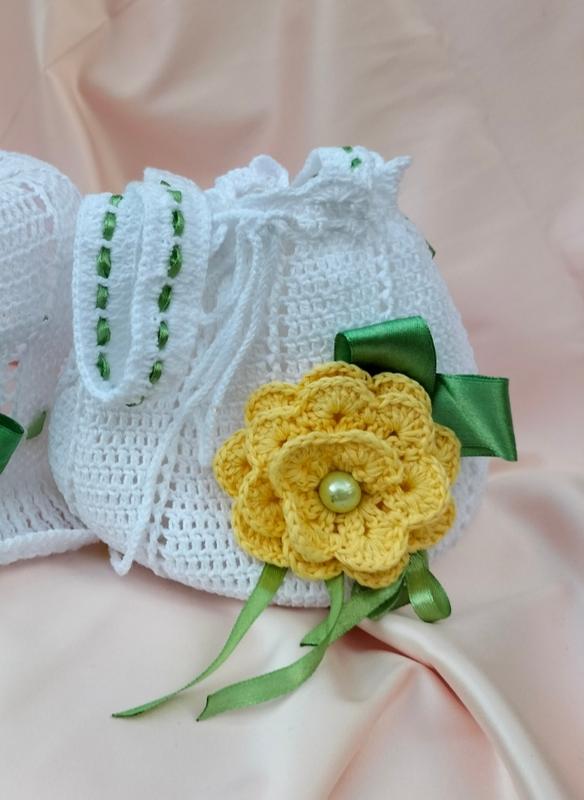 Чарівна в'язана сумочка для маленької принцеси з об'ємною жовтою квіткою Особливості: • 100% ручна робота • Біла основа з ажурним в'язанням • Об'ємний квітковий декор • Зручна ручка • Компактний розмір для дитячих речей Ідеально підходить для зберігання дрібничок, іграшок або як стильний аксесуар для прогулянок. Унікальний дизайн та якісне виконання роблять цю сумочку особливим подарунком для вашої маленької модниці.