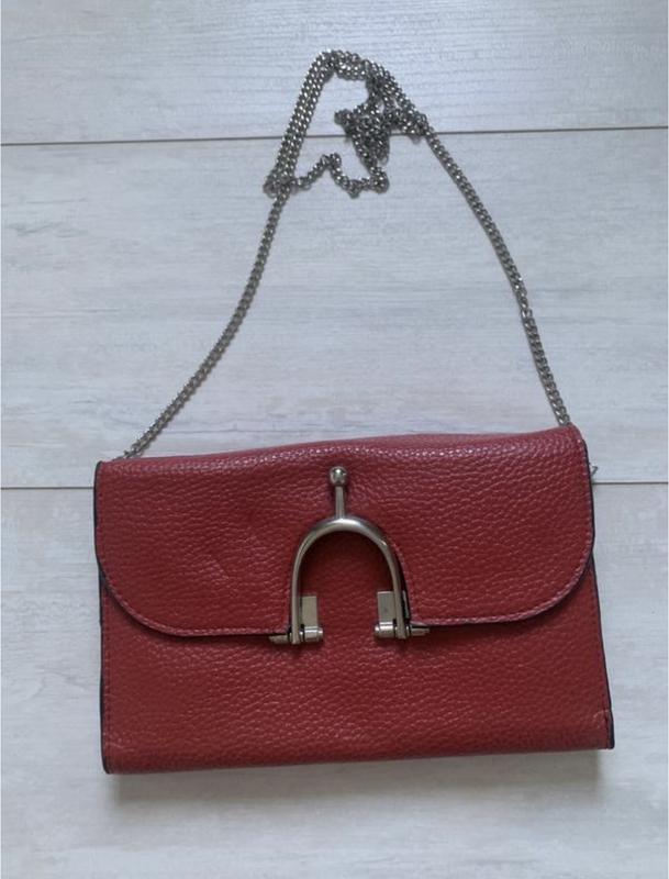Це червона сумка-клатч із зернистої шкіри з металевим ремінцем-ланцюжком та застібкою у фо...