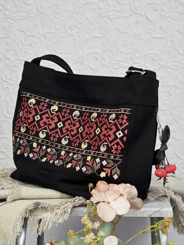 Чорна сумка з вишивкою моделі “Птаха” — ідеальний вибір для сучасної жінки, яка цінує українську автентичність та максимальну зручність. ❀ Пошита з високоякісного щільного канвасу чорного кольору. Канвас це символ витривалості, стійкий до зношення, приємний на дотик і легкий у догляді. ❀ Центральним елементом є традиційна українська вишивка, виконана за стародавніми мотивами. ❀ Має 6 функціональних кишень: 3 кишені на блискавці, 3 відкриті кишені. Забудьте про безлад. ❀ Всередині непромокаюча плащова підкладка. ❀ Регульована ручка (70 см), можна носити сумку як у руках, так і на плечі. ❀ Зверху закривається магнітами. ❀ Прикрашена неповторюваною підвіскою ручної роботи від Sokolova. ❀ Високоякісна фурнітура. ❀ Розмір: 30х28х14 см – ідеальний баланс між компактністю та місткістю. Ця сумка гарно пасує і до джинсів, і до сукні. Вона створена для тих, хто тримає Україну в серці, а комфорт — у пріоритеті.