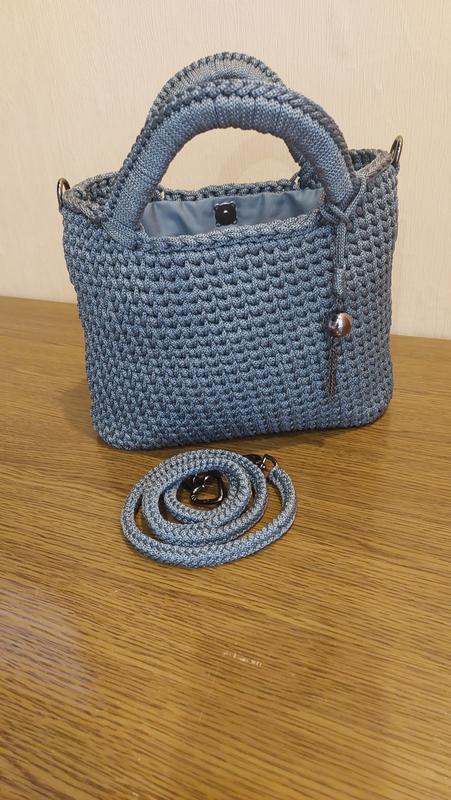 Міні-тоут сірий, елегантний та універсальний Щільна в’язка, сумка чудово тримає форму • Зручні ручки довгий знімний ремінець через плече • Ремінець — 93 см (без карабіна) • Міцна тканинна підкладка всередині • Є внутрішня кишеня для телефону дрібниць • Магнітна застібка • Акуратний декоративний підвіс • Ручна робота, унікальний виріб