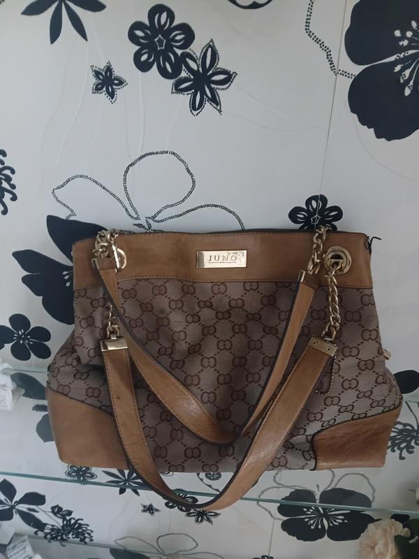 Дуже красива і модна сумка,стилізована під люкс бренд,шкіра та текстиль в монограм.Запитуйте,вмістка,ручки на ланцюжках,всередині багато кишень ,два відділи.Є гаманець на карабінчику,ну дуже стильна сумка.Сліди використання легкі.Вигляд багатий і помітний.Кутики в порядку.