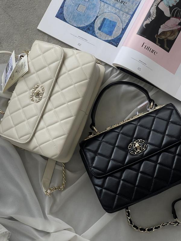 🔠🔠🔠🔠🔠🔠🔠 1️⃣🔣1️⃣ Chanel Trendy CC White Lambskin - Premium код: чорний 20244-1 молочний 20244-2 Всередині три відділення, одне з яких має додатково кишеню на близкавці. Також є кишеня позаду сумки відкрита. Підкладка шкіри в бордовому кольорі, має тистення логотипу та код в середині. На самій сумочці зверху масивний логотип з вплетеною шкірою. Якісна фурнітура, металева та брендована. Ланцюжок з вплетеною шкірою для носіння через плече має фіксовану довжину. Матеріал: шкіра Фурнітура металева з логотипами. Розмір сумки: 26*19*9см Плечовий ремінь: максимально 108см не регулюється. Ручка : висота 10см ⭐️ Магнітна брендова коробка, пильовик та буклети в комплекті.