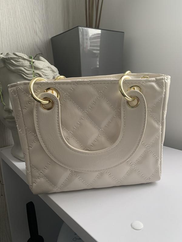 Продам стильну жіночу сумку світлого (молочного) кольору. Акуратний стьобаний дизайн, золотиста фурнітура, добре тримає форму. Підійде як на щодень, так і під елегантний образ.