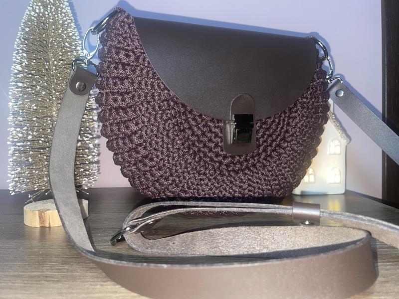 Елегантна в'язана сумка гачком з поліефірного шнура шоколадного кольору з контрастними деталями з натуральної шкіри. Шкіряна ручка , клапани та декоративні вставки додають виробу вишуканості. Ідеальний аксесуар для доповнення до повсякденного стилю.