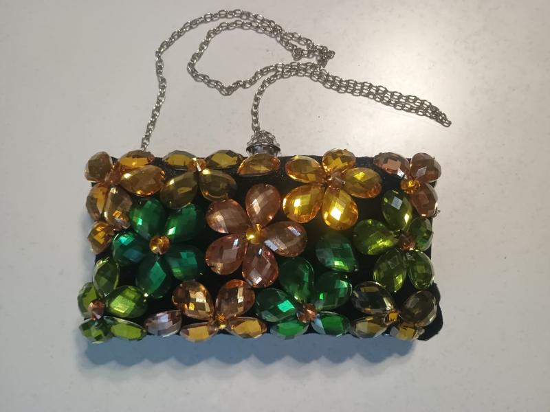 Сумка — клатч, Naomi, чорна, різнобарвна, атласна, квітка. Атлас із камінням утворюють квіти різних відтінків. Ремінь на плече на ланцюжку. Застібка — шпилька, повністю покрита стразами. Розміри: ширина 19 см, висота 10 см, глибина 4 см