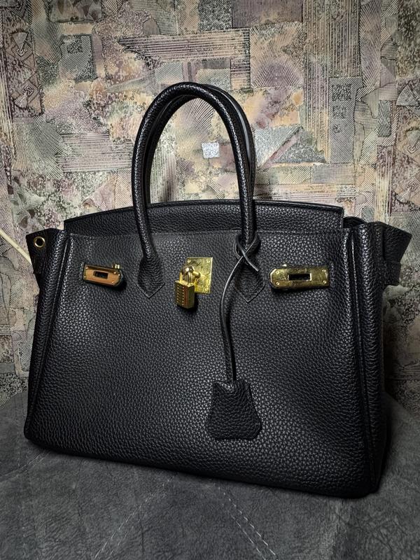 Елегантна жіноча сумка в класичному чорному кольорі з фактурної екошкіри. Сумка добре тримає форму, містка та зручна для щоденного використання або ділових образів. На одній з ручок є невеликий дефект (видно на фото), на носіння та функціональність не впливає.