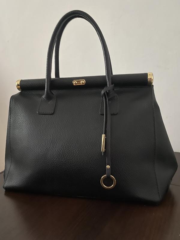 Сумка саквояж щ натуральної шкіри Верх жорсткий, застібка на поворотний замочок Всередині великою кишенею поділяється на два відділу Дві ручки щоб носити в руці Сумка у новому стані, не носилась Ширина верх 30 Дно 33*15 Висота 44 Ручки по 44