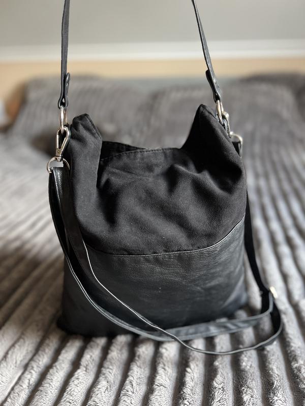Ця сумка-шоппер зі штучної замші має вставку зі штучної шкіри внизу, одну ручку з магнітною застібкою та знімний регульований плечовий ремінь. Усередині є підкладка. Розміри: 34 x 38см.