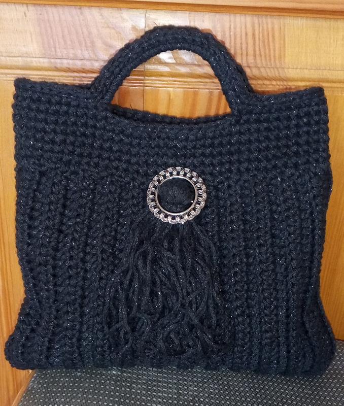 Сумочка «Тоут» Сумочка, в'язана з поліефірного шнура чорного кольору з люрексом. Вона виглядає як стильний аксесуар, що пасує до вечірнього або повсякденного образу. Сумочка середнього розміру, закривається на магнітну кнопку, має підкладку та дві в'язані ручки. Як прикраси додаються брошка та китиця..Дозволяє вмістити все необхідне . Розмір: висота с ручками -27 см., . довжина -24 см., . глибина -18 см