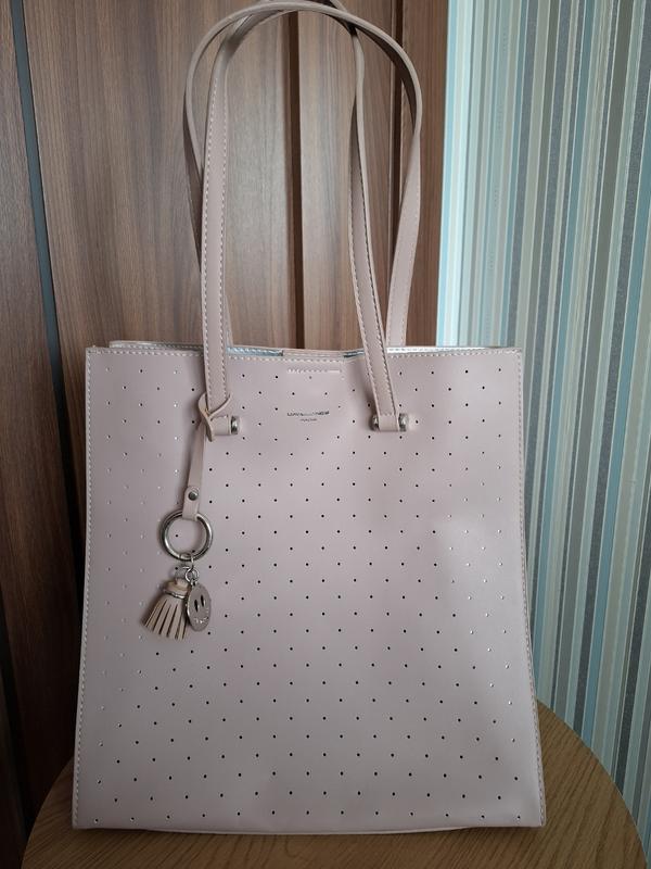 Вмістка сумка David Jones зі штучної шкіри у пудровому кольорі. У чудовому стані, підходить для формату А4. Додатковий довгий ремінець відсутній. Розміри: висота — 31,5 см, ширина — 29 см.