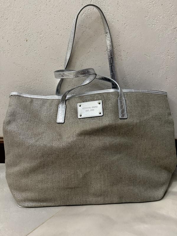 Стилна, рощкішна сумка від Michael Kors, яка поєднує бежевий текстурований матеріал із сріблястими акцентами. Може бути пояжна.має одне основне відділення і одне збоку. Ширина-46 Висота-29 Дно-14 Ручки-50