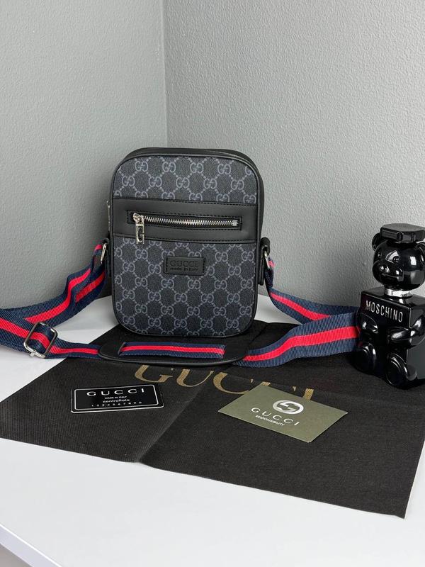 Чоловіча сумка месенджер Gucci 📌Арт. 4403 📌Розмір 21x17x6 см 📌Матеріал: еко-шкіра, металева фурнітура 📌Колір: чорний монограм Ціна: 1650 грн Сумка виготовлена з еко шкіри. Має одне велике відділення. Всередині текстильна підкладка. На лицьовій стороні є ще одна кишеня на блискавці. Ремінець текстильний під стиль бренду, має регулюєму довжину до 120 см. 📌Комплектація: брендова коробка Gucci