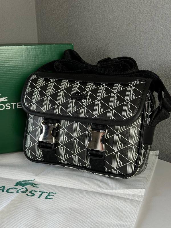 Чоловіча сумка месенджер Lacoste 📌Розмір 22х16х6 см 📌Матеріал: еко-шкіра, металева фурнітура 📌Колір: чорний монограм 💰Ціна: 1650 грн Сумка виготовлена з еко шкіри. Має одне велике відділення. На лицьовій стороні розміщено два металевих фастекса. Всередині сумки є додаткова відкрита кишеня на стінці. Ремінець текстильний брендований, має регулюєму довжину до 120 см. 📌Комплектація: брендова коробка Lacoste