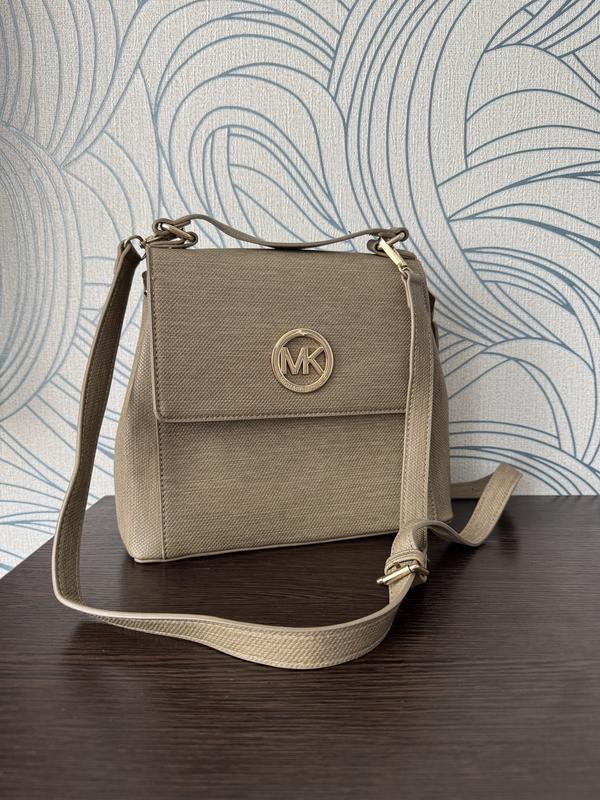 Матеріал: Текстурована екошкіра (під канвас) Застібка: Магніт (на клапані) Габарити (ДхШхВ): 24х18х9 см (орієнтовно для цієї моделі) Кількість відділень: 2 Застібка: Магнітна кнопка, внутрішня змійка Фурнітура: Золотиста Декор: Круглий металевий логотип "MK" Одна незнімна регульована ручка: Висота 32/60 см (сумку можна носити на плече та через плече як крос-боді) Відділення/кишені (внутрішні): Два основні відділення, одна перегородка на змійці, одна відкрита кишеня Внутрішнє оздоблення: 100% фірмовий текстиль з логотипом. Дефекти відсутні.