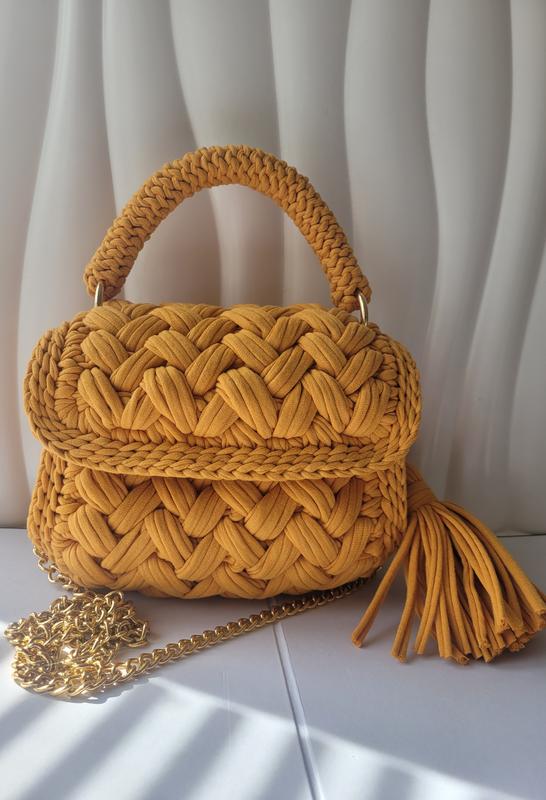 Сумочка виготовлена з якісної трикотажної пряжі 5-7мм,металева фурнітура і ланцюжок.Вшита підкладка. Застібається на магнітні кнопки.