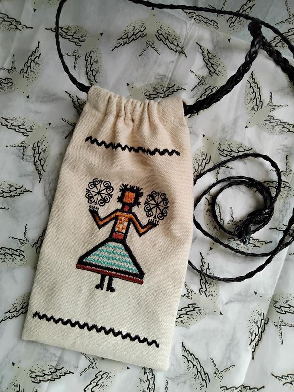 Торбинка - чохол Бережа від українського бренду Ластівка Образ Бережі або Берегині - священний для українців генетичний код, який несе суть творення, захисту. Це символ життя та родючості, символ Матері - Природи, матері усього сущого, яка дає життя і оберігає. Виряджаючи чоловіків та синів у нелегкі походи, матері, дружини й кохані дарували їм амулети - рушники з оберегами, аби живими верталися до рідної домівки. Використано елементи вишивки з рушників Східного Поділля Торбинка двостороння - з однієї сторони символ Бережі, з іншої - військовий, якого вона обороняє. Торбинка виготовлена зі щільного канвасу, добре тримає форму, на підкладці. В комплекті шкіряна мотузка, яка регулюється. Розміри - 19x10,5 см. В неї вміщується телефон та всілякі потрібні дрібнички