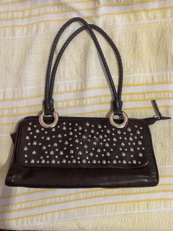 Дуже гарна коричнева сумка з металевими вставками. Ідеальний стан, єдиний недолік ледь помітні потертості (фото додала)