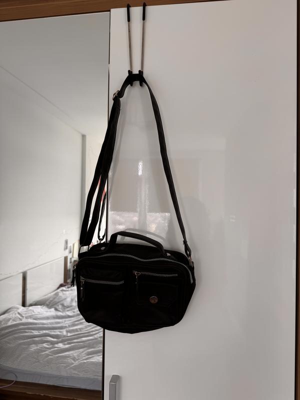 Чорна кросбоді-сумка з нейлону з кількома кишенями та блискавками і регульованим ремінцем в хорошому стані. єдиний дефект - всередині трішки покошлатилась тканина з однієї сторони (видно на фото).