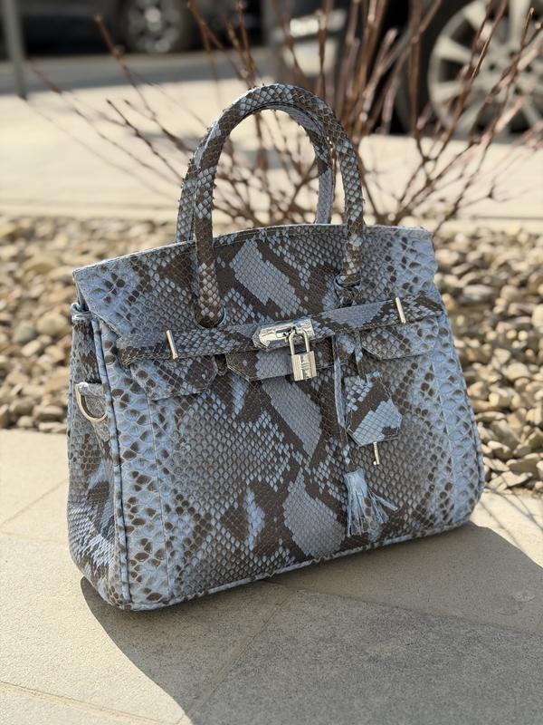Сумка із голубого пітона. Розмір 35 см. Фурнітура серебро.всередені дві кишені( під телефон і за блискавці). В комплекті довгий ремінець.всередені оздоблена натуральною шкірою наппа.До неї є куртка із пітона з такої ж шкіри.(дивиться на сторінці)