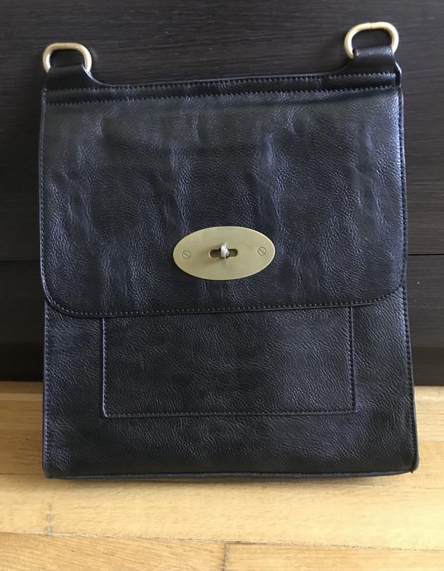 Шкіряна чорна сумка Mulberry Сумка чорного кольору із натуральної шкіри, шкіра зерниста якісна, стійка до подряпин. Фурнітура мідна дуже якісна. Сумка має одне підділення всередині з кишенькою під замочком, і ще по одній кишені з обох сторін , одна з них під замочком. Єдине що немає плечового ременя. Ширина 24,5 Висота 28 Ширина дна 6