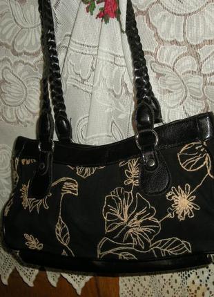 Шикарна сумка чорного кольору з чорної тканини,на якій вишиті квіти і листя бежевого кольору,дно сумки,верх і ручки з тонкого шкірозамінника,ручки сплетені кіскою,усередині три відділення,середнє застібається на замок-блискавку,два інших застібається на кнопки+один маленький кишеня на замку-блискавці,довжина сумки-31см.,висота-16 см.,ширина-10см.,сумка застібається на замок-блискавку.