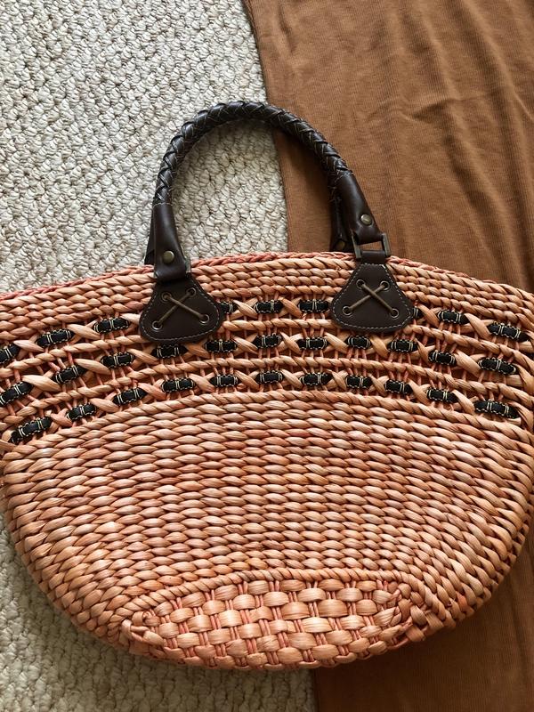 💐модна у цьому сезоні сумочка. Сток з Європи , пастельний персиковий колір + акценті ручки, дуже стильне поєднання 😍 100% натуральне кукурудзяне лушпиння 💐виміри : ширина - 41, довжина -30 💐вмістка, всередині один великий відділ і дві кишеньки 💐зовні як нова, ручки цілі, всередині нюанси (6.7) фото -плями на підкладці, на носку ніяк не впливає , запаху секонда немає!!!