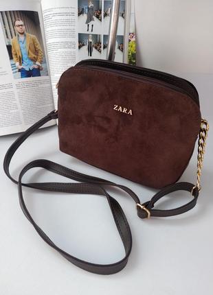 Очень красивая повседневная сумочка ZARA. Натуральная замша и экокожа. Три отделения на подкладе с кармашками. С тыльной стороны сумки карман на молнии. В дне металлические ножки. Длинный регулируемый ремень. Размер 25х19х6см. В наличии Розовая Шоколад