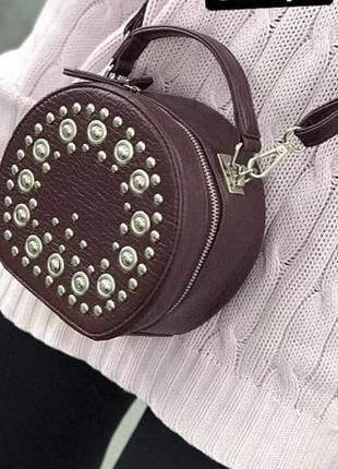 Красивая сумочка круглой формы с короткой ручкой и длинным ремнём через плечо. Диаметр 15 см, глубина 9 см. Ремень максимально 130 см регулируется. Три цвета в наличии