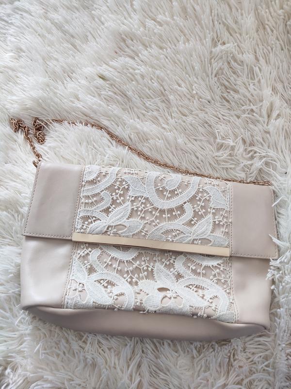 Брендова сумка клатч бежевого кольору з білою мереживною вставкою, в чудовому стані. З нюансів: маленькі царапинкі на фурнітурі спереду та слід від клею в середині(на останньому фото, який вже був одразу з нею). Розміри: ширина 30.5 довжина 18