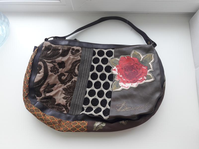 Сумка Desigual 39× 26×10 див. 2 основних відділу на блискавках, маленький відділ на внутрішній стінці, декілька внутрішніх кишень. 2 ручки довжиною 44 див.
