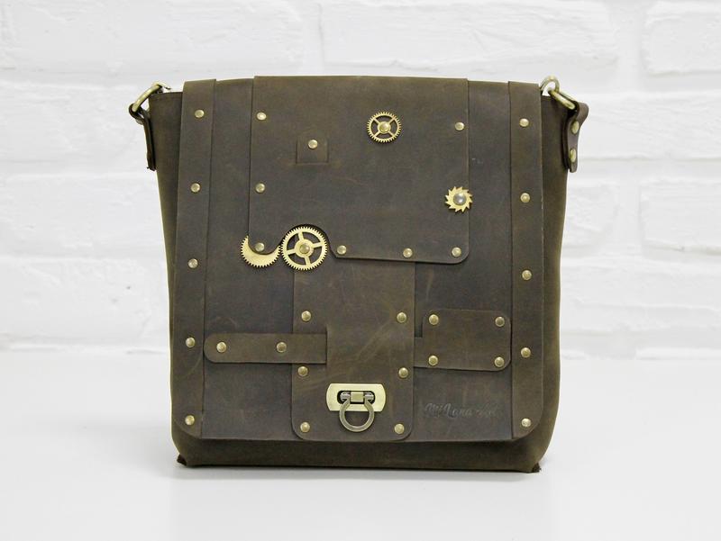 Жіноча сумка з натуральної шкіри ручної роботи у стилі стімпанк 📌 Характеристики Висота - 25 см Довжина - 25 см Ширина - 8 см Якісна фурнітура Шкіра - crazy horse Колір: шоколад ❗Всі товари в єдиному екземплярі. Перед покупкою просимо уточнювати наявність товару 🪡🧵Можемо пошити після передоплати