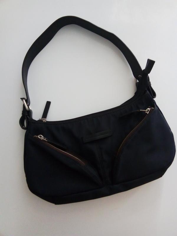 Маленька темно синя фірмова сумочка. Матеріал щільна тканина. Всередині одне велике відділення, кишеня на змійці, 2 невеликих кишені. Спереду 2 кишені на змійці, ззаду 1. Всі змійки справні. Фурнітура фірмова. Заміри 31*16. Ручка регулюється, хв 50 див.