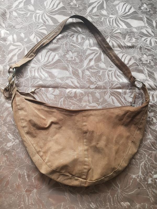 небольшая сумка- мешок из эко замши приглушенно рыжего цвета. ширина 40 см, высота 20 см. длина ручки 60 см