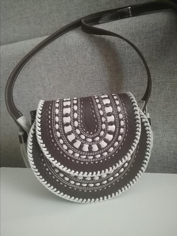 стильна шкіряна сумочка ручної роботи/ художня обробка шкіри/.Не дивлячись на невеликий розмір в діаметрі 20см. є дуже місткою.Буде надзвичайним доповненням як до народного вишиваного одягу так і до сучасного.При потребі може бути будь - який замовлений колір.довгі ручки -130см.