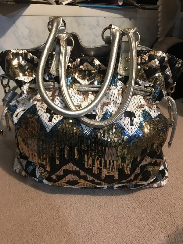 Нарядная красивая , вместительная сумка , новая. Паетки впереди , серебро тыльная сторона. Есть небольшая мтертость на одной ручке, не аккуратно перевозили в чемодане