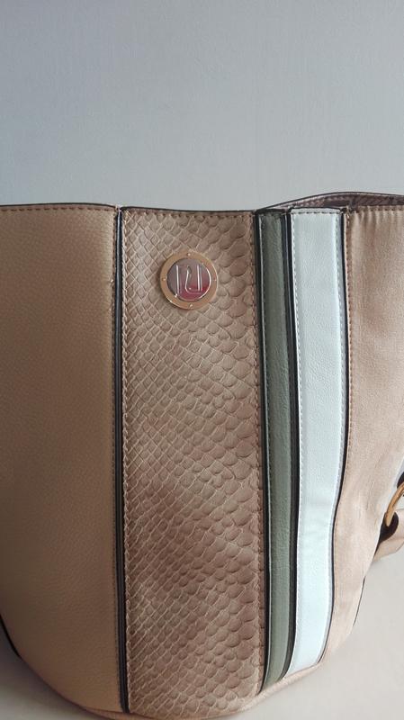 Сумка з якісного щільного шкірозамінника.Має одне основне відділення в ньому два додаткових кишені.Зверху закривається тільки на хлястик з магнітною кнопкою.Довжина по низу-22,по верху-33,ширина-21,ручка-90.Сумка нова з етикеткою,без дефектів.